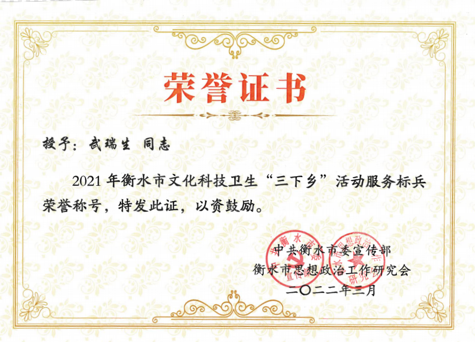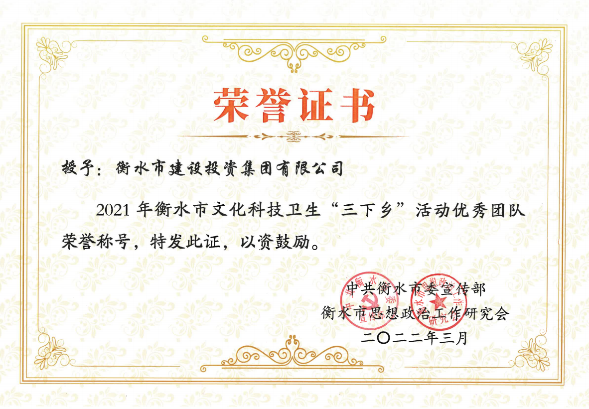 近日,市建投集團(tuán)被中共衡水市委宣傳部、衡水市思想政治工作研究會(huì)授予“2021年衡水市文化科技衛(wèi)生‘三下鄉(xiāng)’活動(dòng)優(yōu)秀團(tuán)隊(duì)”榮譽(yù)稱(chēng)號(hào),武瑞生同志被授予“2021年衡水市文化科技衛(wèi)生‘三下鄉(xiāng)’活動(dòng)服務(wù)標(biāo)兵”榮譽(yù)稱(chēng)號(hào)。
